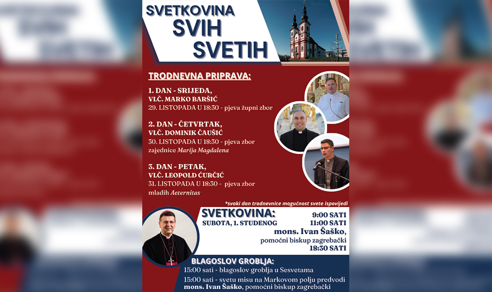 Trodnevnica uoči svetkovine održat će se od srijede (29. listopada) do petka (31. listopada) večernjim svetim misama s početkom u 18.30h.